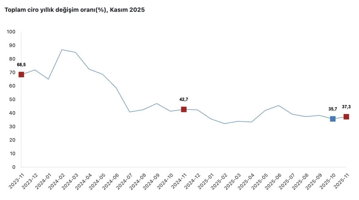 Buna göre, mevsim ve takvim etkisinden arındırılmış toplam ciro endeksi, Kasım 2025’te aylık bazda yüzde 3,7 arttı.