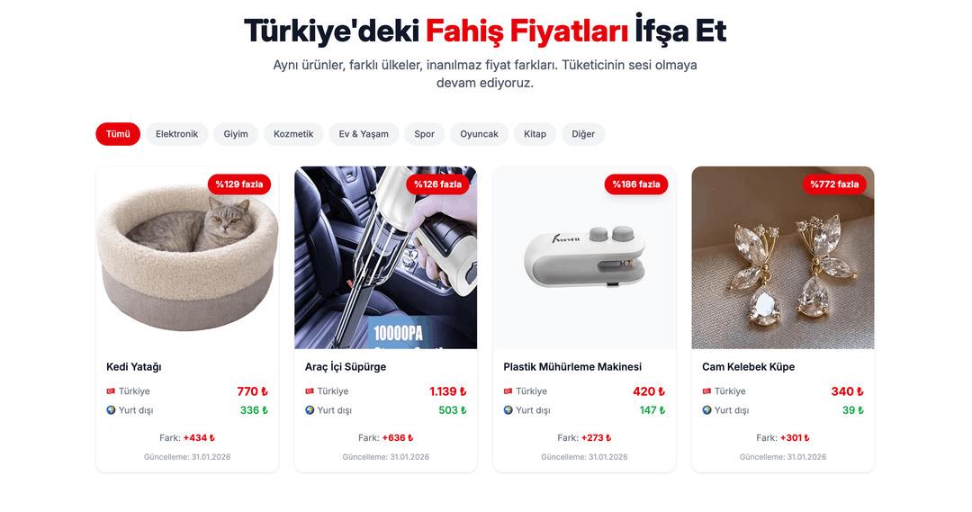 Hürriyet Partisi tarafından hayata geçirilen site, vatandaşların gönderdiği ürünlerin Türkiye’deki satış fiyatı ile yurt dışındaki fiyatını yan yana koyarak aradaki farkı yüzdesel olarak hesaplıyor. Sitede halihazırda elektronik, giyim, kozmetik ve spor gibi çok sayıda kategoride ürün bulunuyor.