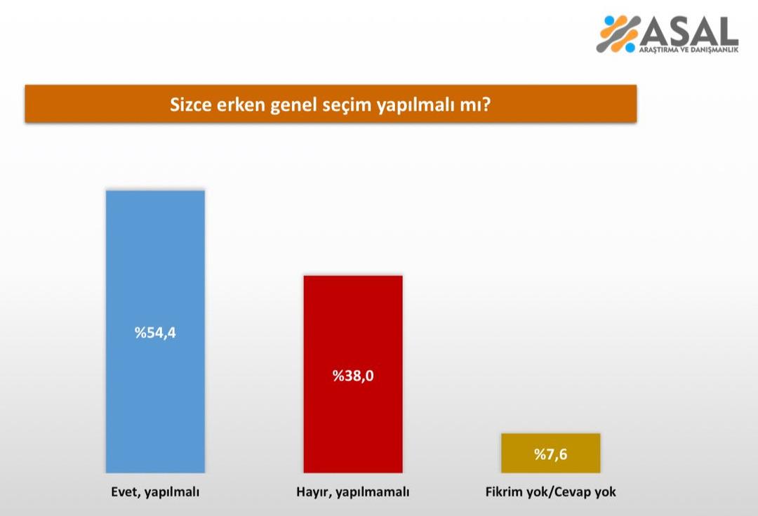 MHP Genel Başkanı Devlet Bahçeli’nin erken seçim tartışmalarına sert sözlerle kapıyı kapatmasının ardından, kamuoyunun nabzı bu kez anketlere yansıdı. ASAL Araştırma’nın 26 ilde 2 bin kişiyle gerçekleştirdiği Ocak 2026 anketinde, “Erken genel seçim yapılmalı mı?” sorusuna katılımcıların yüzde 54,4’ü “evet” yanıtını verdi. Yüzde 38’lik kesim erken seçime karşı çıkarken, yüzde 7,6’lık bölüm ise fikrinin olmadığını belirtti. Ortaya çıkan tablo, erken seçim tartışmalarının siyasi kulislerin ötesinde toplumda da güçlü bir karşılık bulduğunu gösterdi.