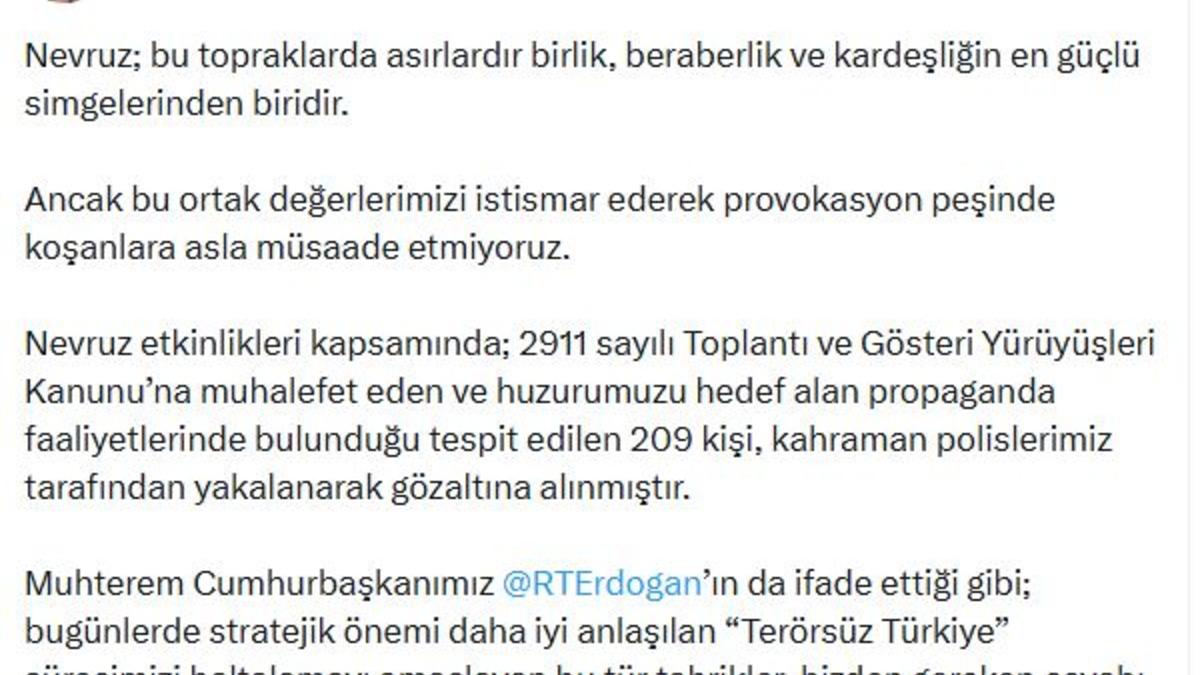 İçişleri Bakanı Mustafa Çiftçi de sanal medya hesabından yaptığı açıklamada, “Nevruz; bu topraklarda asırlardır birlik, beraberlik ve kardeşliğin en güçlü simgelerinden biridir. Ancak bu ortak değerlerimizi istismar ederek provokasyon peşinde koşanlara asla müsaade etmiyoruz. Nevruz etkinlikleri kapsamında, 2911 sayılı Toplantı ve Gösteri Yürüyüşleri Kanunu’na muhalefet eden ve huzurumuzu hedef alan propaganda faaliyetlerinde bulunduğu tespit edilen 209 kişi, kahraman polislerimiz tarafından yakalanarak gözaltına alınmıştır. Muhterem Cumhurbaşkanımız Recep Tayyip Erdoğan’ın da ifade ettiği gibi, bugünlerde stratejik önemi daha iyi anlaşılan ‘Terörsüz Türkiye’ sürecimizi baltalamayı amaçlayan bu tür tahrikler, bizden gereken cevabı mutlaka alacaktır” ifadelerini kullandı.