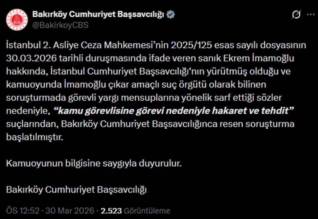 “İstanbul 2. Asliye Ceza Mahkemesi’nin 2025/125 esas sayılı dosyasının 30.03.2026 tarihli duruşmasında ifade veren sanık Ekrem İmamoğlu hakkında, İstanbul Cumhuriyet Başsavcılığı‘nın yürütmüş olduğu ve kamuoyunda İmamoğlu çıkar amaçlı suç örgütü olarak bilinen soruşturmada görevli yargı mensuplarına yönelik sarf ettiği sözler nedeniyle, “kamu görevlisine görevi nedeniyle hakaret ve tehdit” suçlarından, Bakırköy Cumhuriyet Başsavcılığınca resen soruşturma başlatılmıştır.