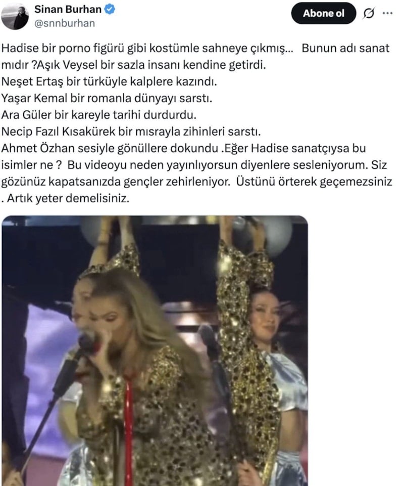 Burhan paylaşımında, “ Hadise p*rno figürü gibi kostümle sahneye çıkmış… Bunun adı sanat mıdır?” dedi.