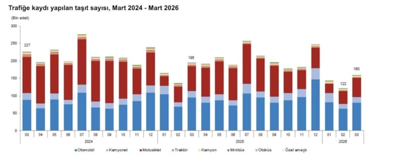 Mart ayında 159 bin 931 adet taşıtın trafiğe kaydı yapıldı. Mart ayında trafiğe kaydı yapılan taşıtların yüzde 50,2’sini otomobil, yüzde 34,8’ini motosiklet, yüzde 10,1’ini kamyonet, yüzde 1,7’sini kamyon, yüzde 1,6’sını traktör, yüzde 1,0’ını minibüs, yüzde 0,5’ini otobüs ve yüzde 0,1’ini özel amaçlı taşıtlar oluşturdu.