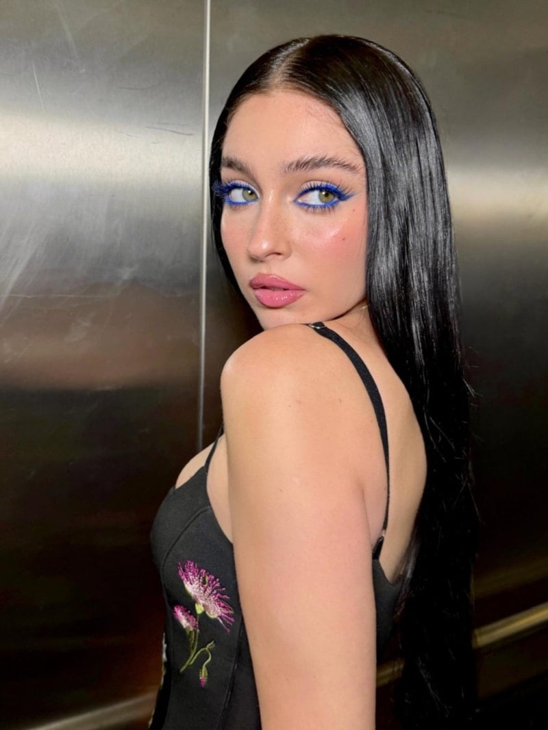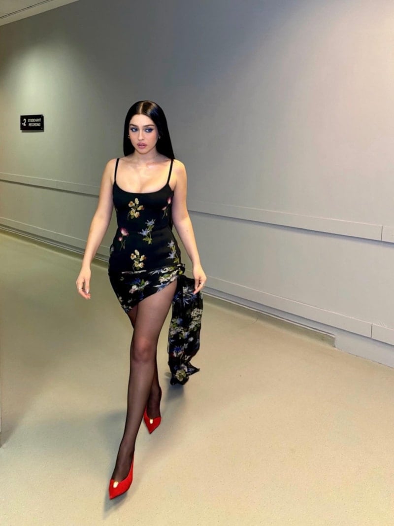 Siyah üzeri çiçek desenli mini elbise, zarif askıları ve vücuda oturan kesimiyle feminen bir silüet ortaya koyuyor. Derin yırtmaç detayı ve transparan çorapla tamamlanan görünüm, şıklığı cesur bir dokunuşla buluşturuyor.